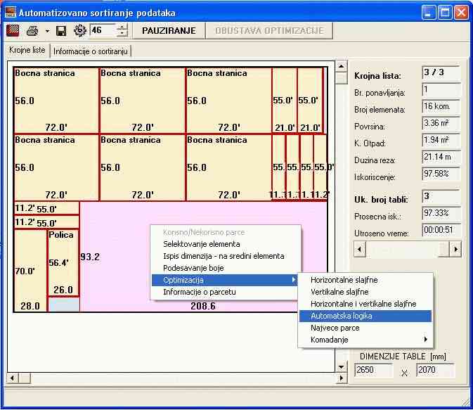 • Vođenje evidencije o korisnim ostacima, sa automatskih pozivanjem pre svake optimizacije